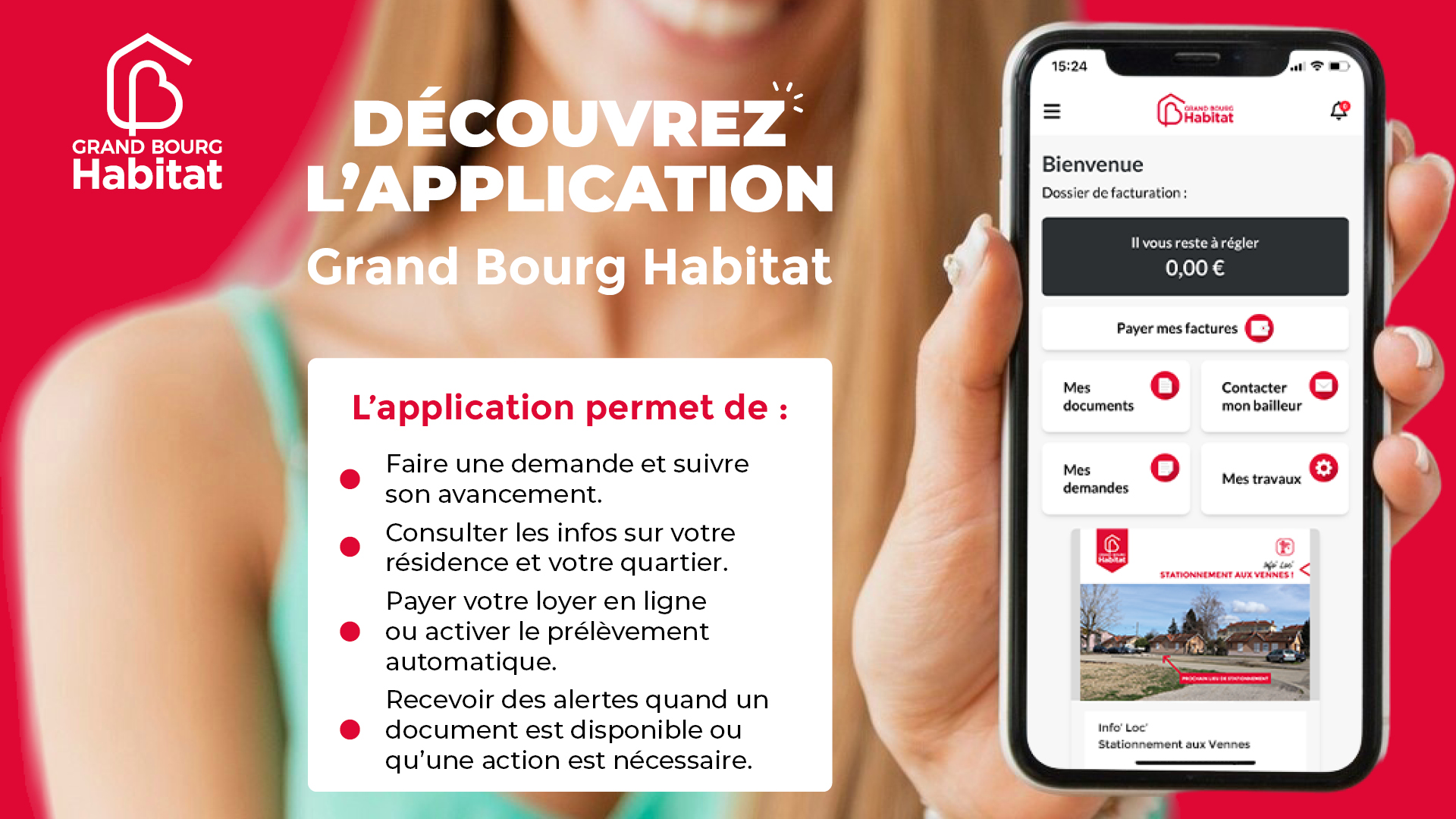 Bonne nouvelle ! L’application Grand Bourg Habitat est désormais disponible sur smartphone, 24h/24 et 7j/7, pour faciliter vos démarches en tant que locataire.
